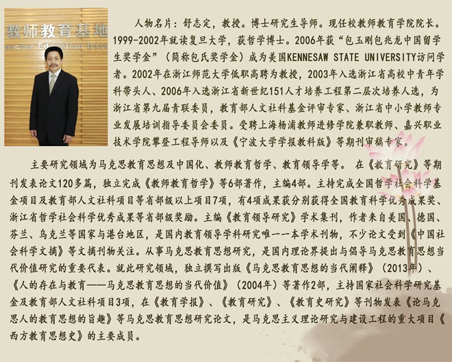 舒志定:我的主要研究领域是教育哲学。近年来主要聚焦马克思教育思想及其当代价值、教师教育学、教育领导学等领域的教学、研究和人才培养工作。其中,马克思主义教育思想及当代价值研究,我是从2002年开始就一直坚持研究到现在,主持完成马克思教育思想研究的国家社科基金项目和教育部人文社科项目,去年又主持《马克思人学教育思想当代价值研究》等教育部人文社科项目,研究论文在《教育研究》、《教育学报》等期刊发表,出版《马克思教育思想的当代阐释》《人的存在与教育—马克思教育思想当代价值》等著作。教师教育哲学研究也是我的研究兴趣。我是从东西方教育哲学思想汇通中阐述教师教育哲学的理论框架,从解释学教育学、现象学教育学等教育思潮中寻求中国教师教育哲学理论构建的思想资源。与教师教育研究相关的,是教育领导学的研究。这也是我新拓展的研究领域。教育领导学是教育管理理论发展的新成果。管理是如何把事情做正确,而领导则是做正确的事情。这三个研究领域,我是用马克思提出的“现实中个人”作为研究教育的逻辑起点,以“人是对象性存在”作为研究教育的思想方式,使三个研究领域的研究假设与研究旨趣相互关联、一以贯之。
