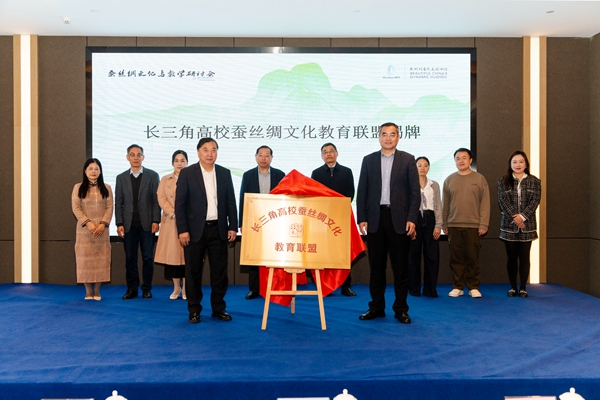 开幕式上,金佩华和姚菊明共同为长三角高校蚕丝绸文化教育联盟揭牌。